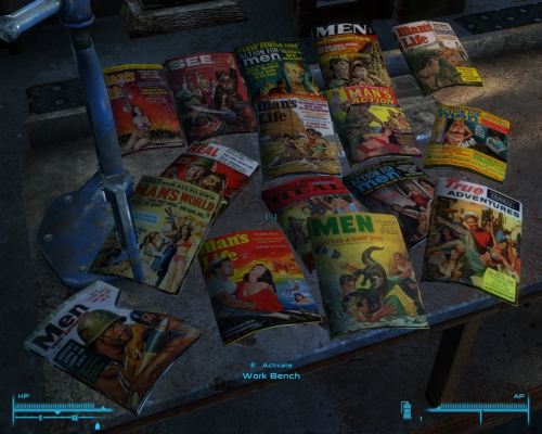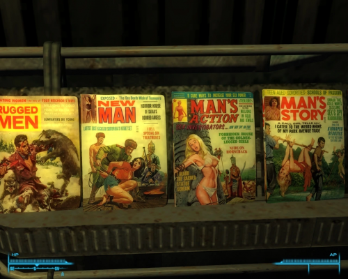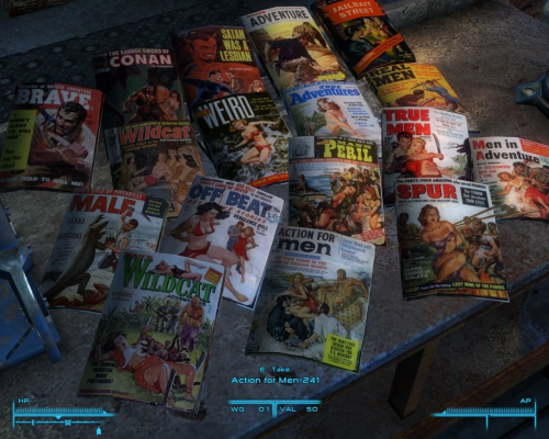 Action for Men предлагает вам погрузиться в мир Нью-Вегаса с помощью 66-го и 265-го выпусков винтажных журналов о боевиках и приключениях 50-х и 60-х годов. Вы можете открывать и коллекционировать эти уникальные издания. За открытие каждого выпуска вы получите одно очко опыта.