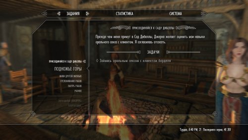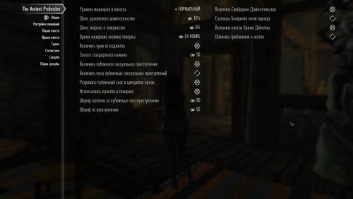Незаконная проституция есть преступление. Выполняйте квесты, чтобы получить лицензию на работу в каждом из владений Скайрима. Секс на публике - тоже преступление. Занимайтесь сексом в уединении. Впрочем, вы можете включить опцию в мсм, позволяющую считать публичный секс преступлением только в дневное время.