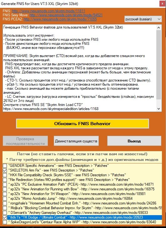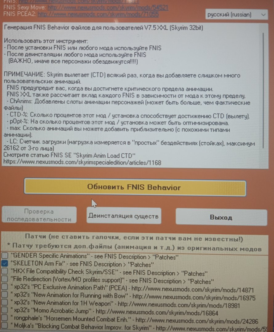 Запускаю фнис, отмечаю тктк1 и скелетон фикс и нажимаю обновить фнис