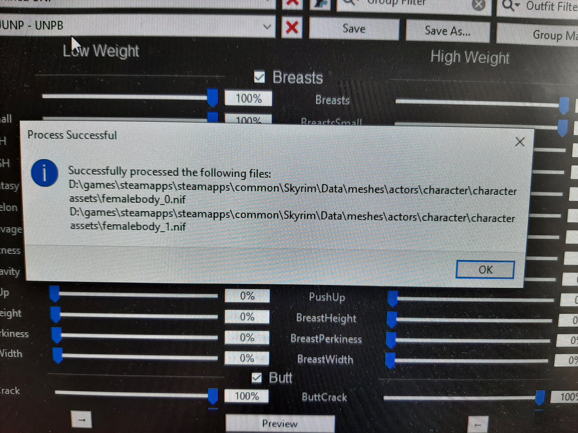 Я смотрю, что ты выбрал UNP - UNPB тело. Сборка создана под CBBE тело, причём из LE версии. Поэтому и пресеты ты должен выбирать только для CBBE LE тела. Можешь также попробовать выбрать из списка пресет CBBE HDT (физика груди, попы, живота) или CBBE TBBP (физика только груди и попы). Но стандартные пресеты могут иметь отличную форму тела, от той, что использовал Торн. При снятии одежды это легко заметить. В этой папке также есть пресеты Торна, но я не знаю какие он использовал для создания тела. Поэтому, самый простой способ вернуть всё как есть - это заменить эти два файла.