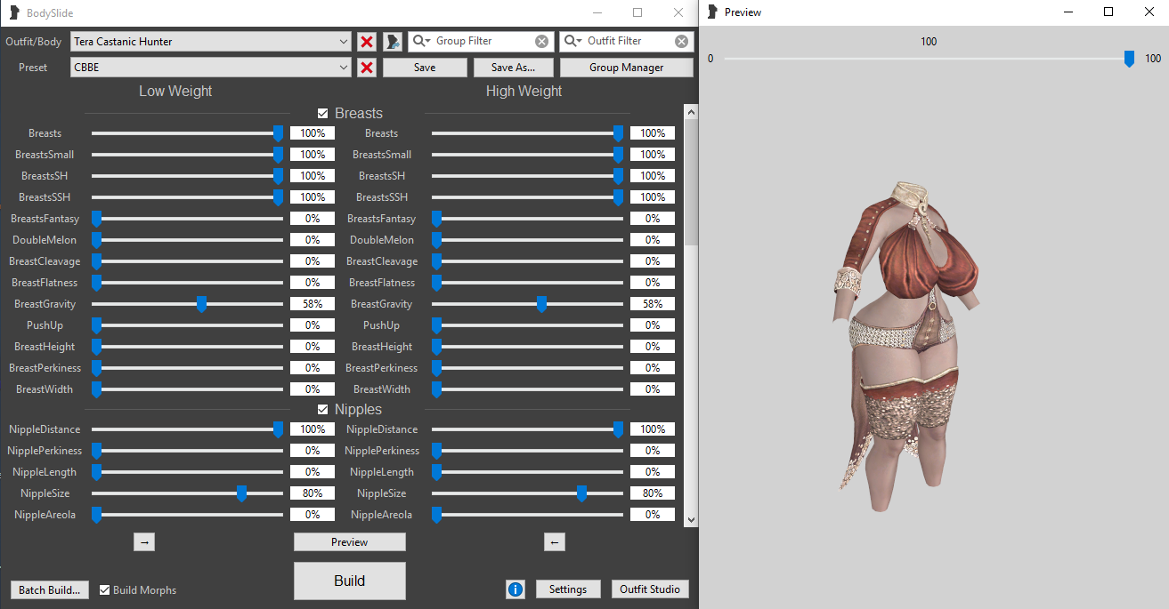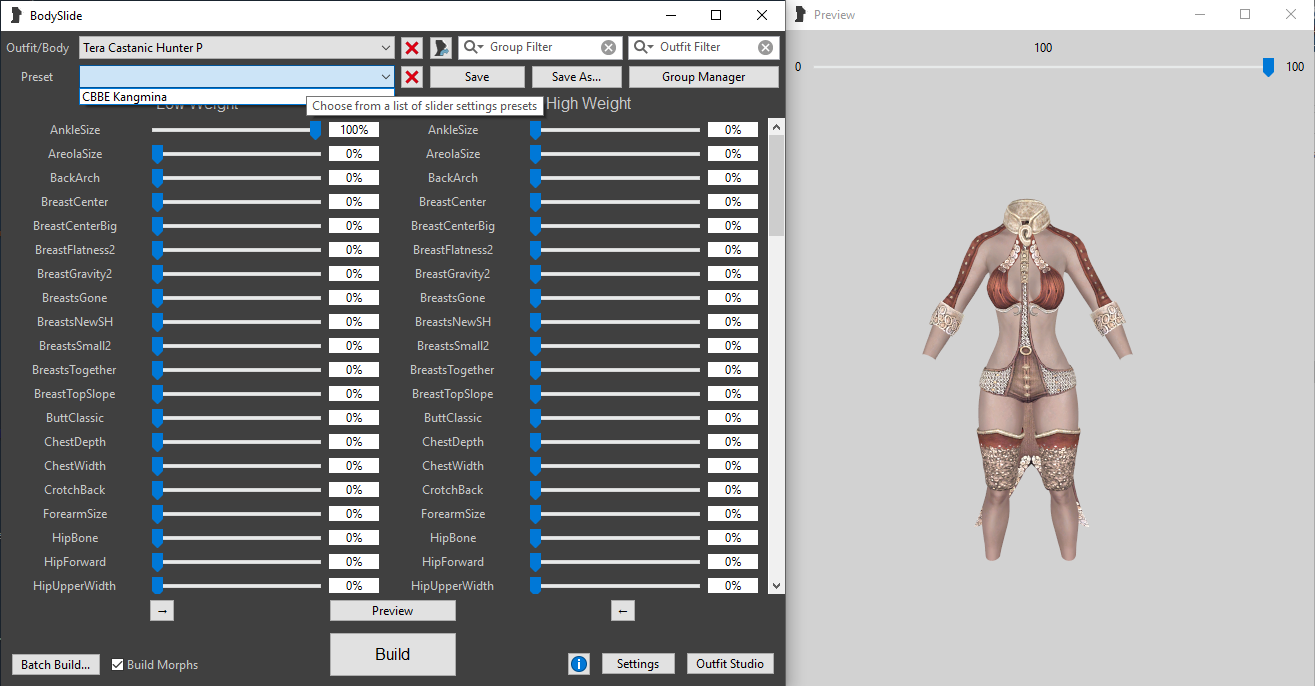 @ravist Ты не так делаешь. Нужно выбрать тело а не одежду. Выбрав нужное тело и пресет, изменить его как хочешь, потом нажать внизу слева Batch Build, откроется список всех модов, выбрать в нем нужное отметив галочками и сохранить нажав Build.