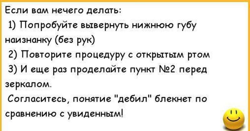 "Что делать если делать, собственно, нечего? Чем заполняет досуг в таких случаях среднестатистический обыватель? Был произведено тестирование 1000 скучающих обывателей, в результате было обнаружено два любопытных факта. Оказывается, мозг от томления духа никак не страдает и благополучно переходит в спящий режим через 15 минут бездействия. Весь груз томления падает на руки, которые без участия мозга начинают жить своей жизнью (как правило, это происходит минут через 40 ). Об этом свидетельствуют экшены, которые являются результатом упомянутого выше тестирования. Итак: 27% обывателей ковыряются в носу 12% лузгают сёмки 9% самоудовлетворяются (онанизм) 3% поплевывает из окна или бросаются капустой в прохожих с балкона .....и так далее (в основном подобная чепуха)"