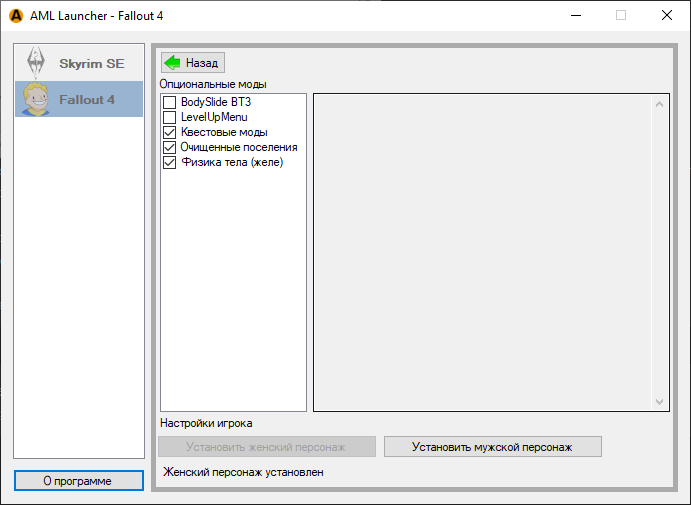 По умолчанию игра устанавливается для женского персонажа(ЖГГ) без дополнительных квестовых модов. Чтобы добавить контент, нажмите кнопку Настройки и опции. Поставьте галочки интересующих вас модов и они сразу установятся в игру.