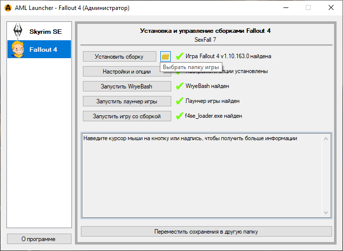 Требуемая версия игры: строго - Fallout 4 - 1.10.163.0 с 6 или 7 DLC. Другие версии несовместимы!