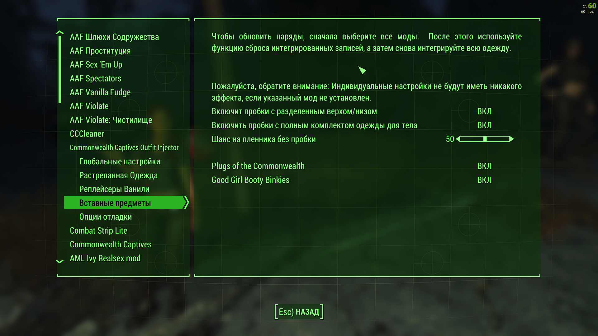 ... что-то непонятное происходит, почти у всех пленниц в за****цах пробки торчат, ... вытаскивать их , как я понял (чуть раньше писал об этом) нельзя , а наблюдать за этим , скажем так некомильфо (они ж теперь уже не пленницы) они теперь полноценные уважаемые поселенки, ... поискал способ решения в "настройках модов" , что-то там поотключал где увидел слово пробки, но ничего не изменилось, ... если это не тайна века , можно сказать какой мод за эти пробки отвечает ...