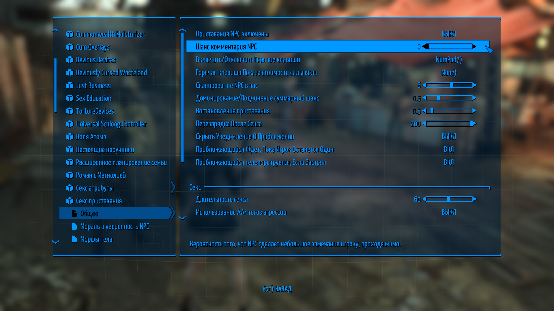 У меня сейчас данный мод отключен, но это должно быть в пробках содружества, там шанс комментария и номер слота.