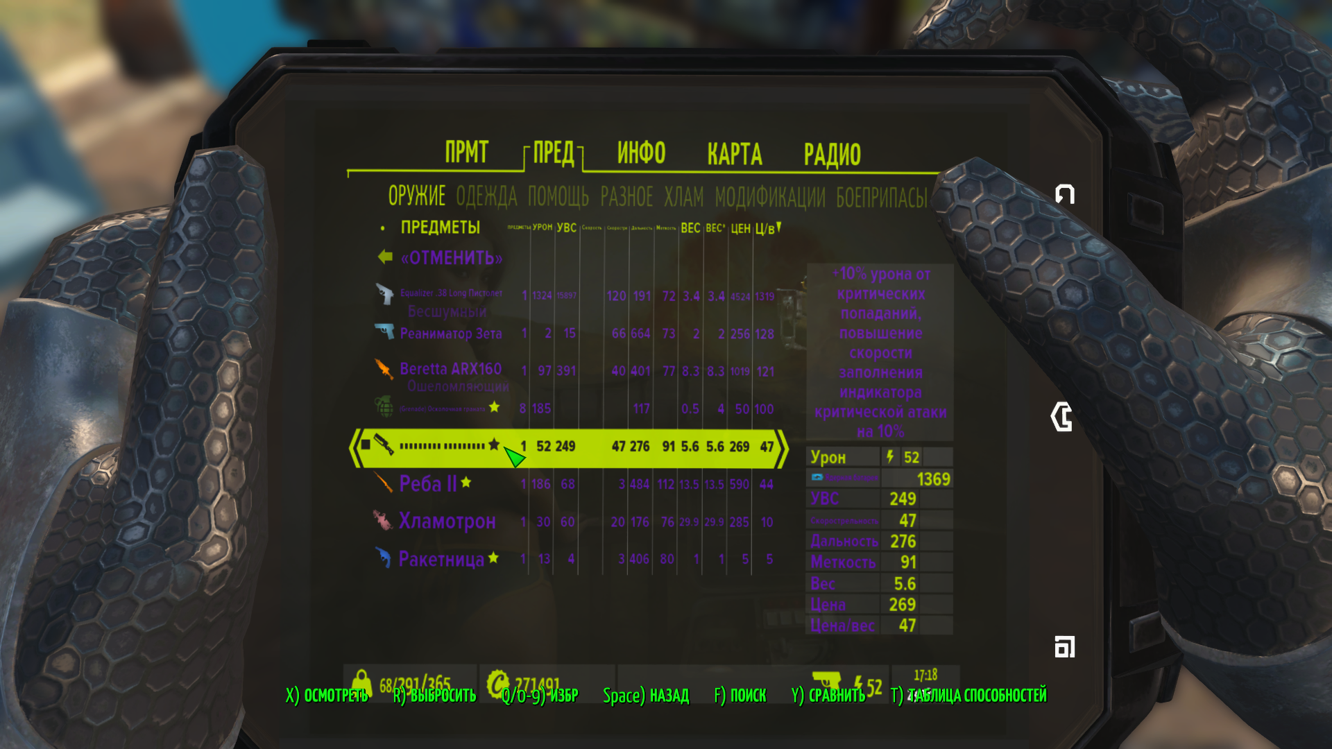 Сверху различные счетчики инвентаря (крышки, вес, адреналиновые инжекторы, ремонтные наборы и многое другое) и игровое время
