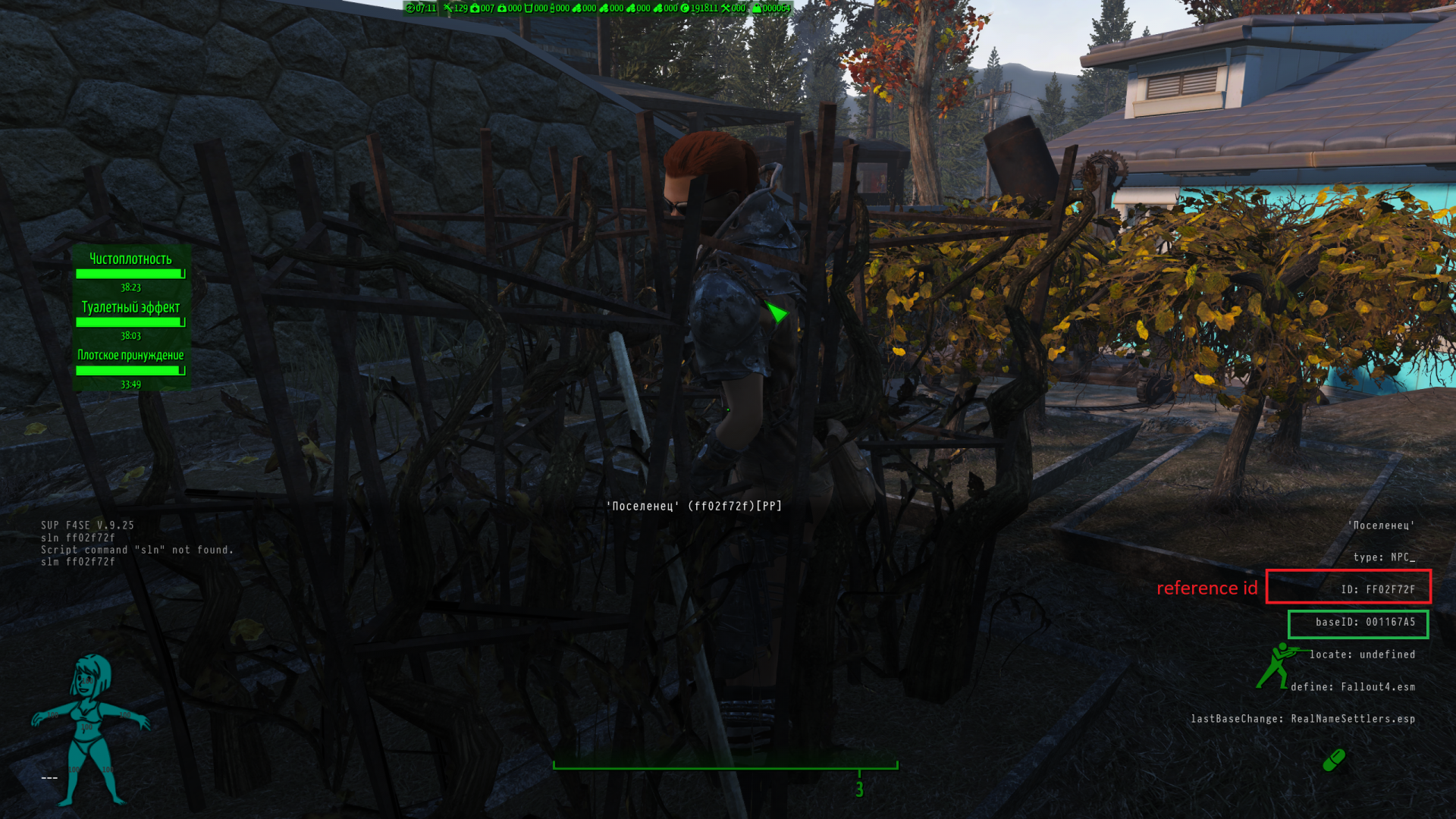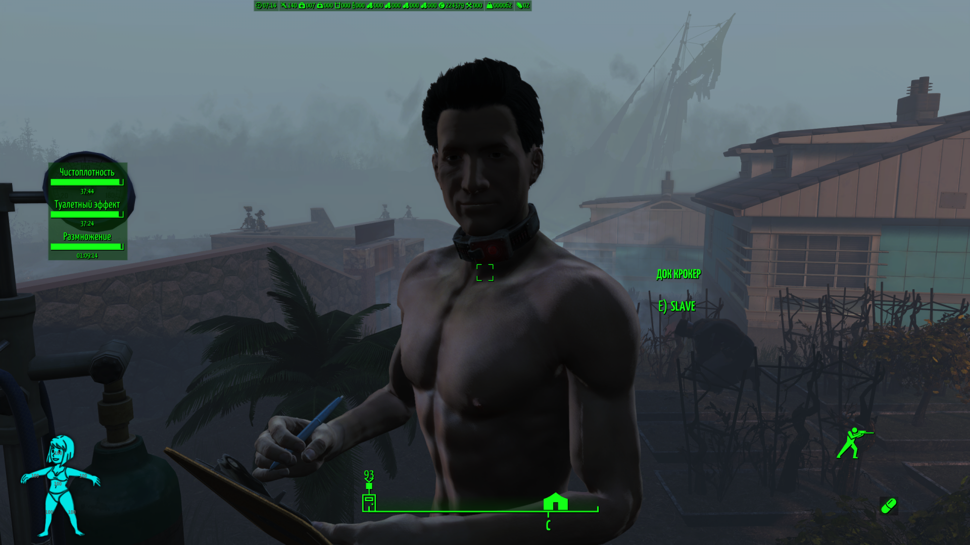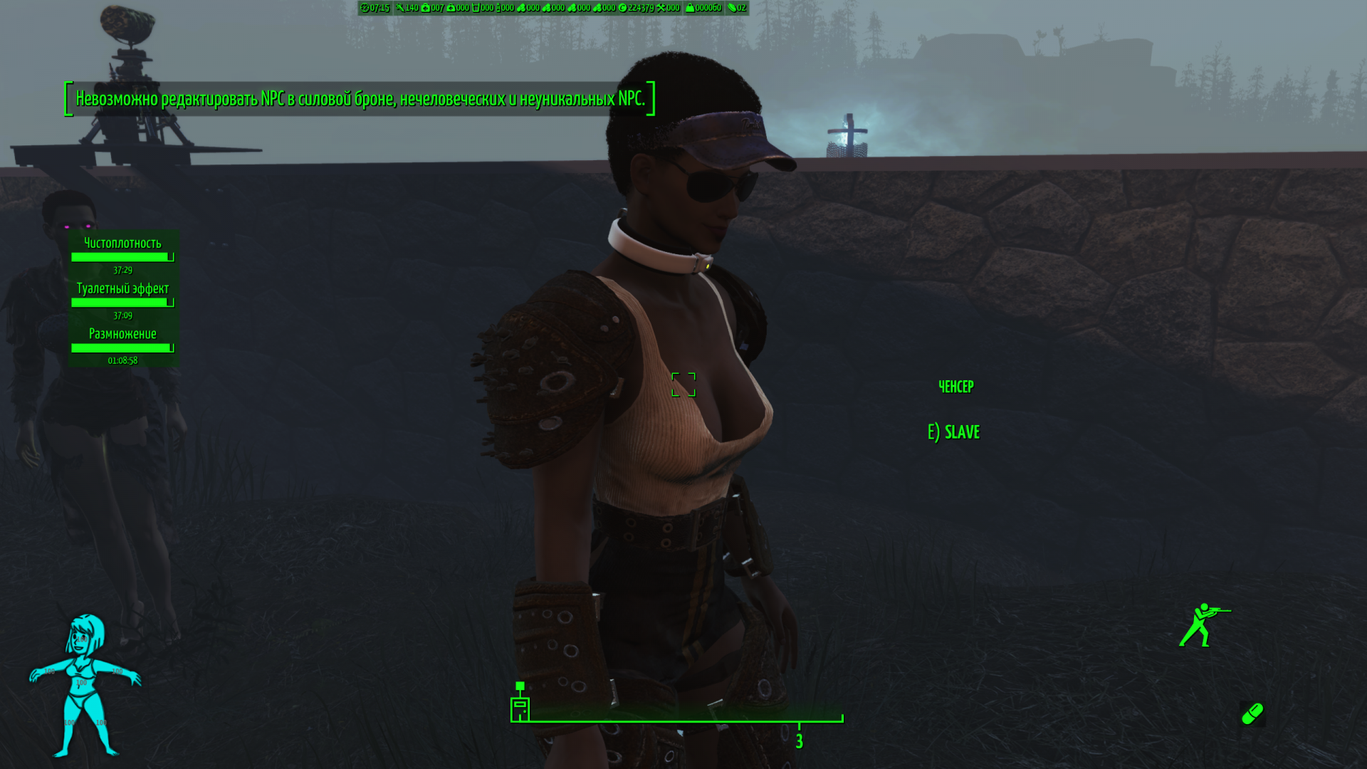Вот так изменил раба Дока Крокера. Голова поменялась через Looksmenu вызванный с помощью клавиши ;. Но тело не менялось. Попробовал позже в консоли через slm  и сделал ему пузо и оно сохранилось. Что странно, потому что и то и другое в принципе делалось в том же самом LooksMenu, просто одно вызвано встроенной клавишей, второе консолью. Мне кажется что это сработало только потому что Док Крокер уникальный НПС. Потому что про Just Business уже говорилось что он не может менять внешность рейдеров и стрелков, я так понял от того что их внешность генериться случайно в начале игры.