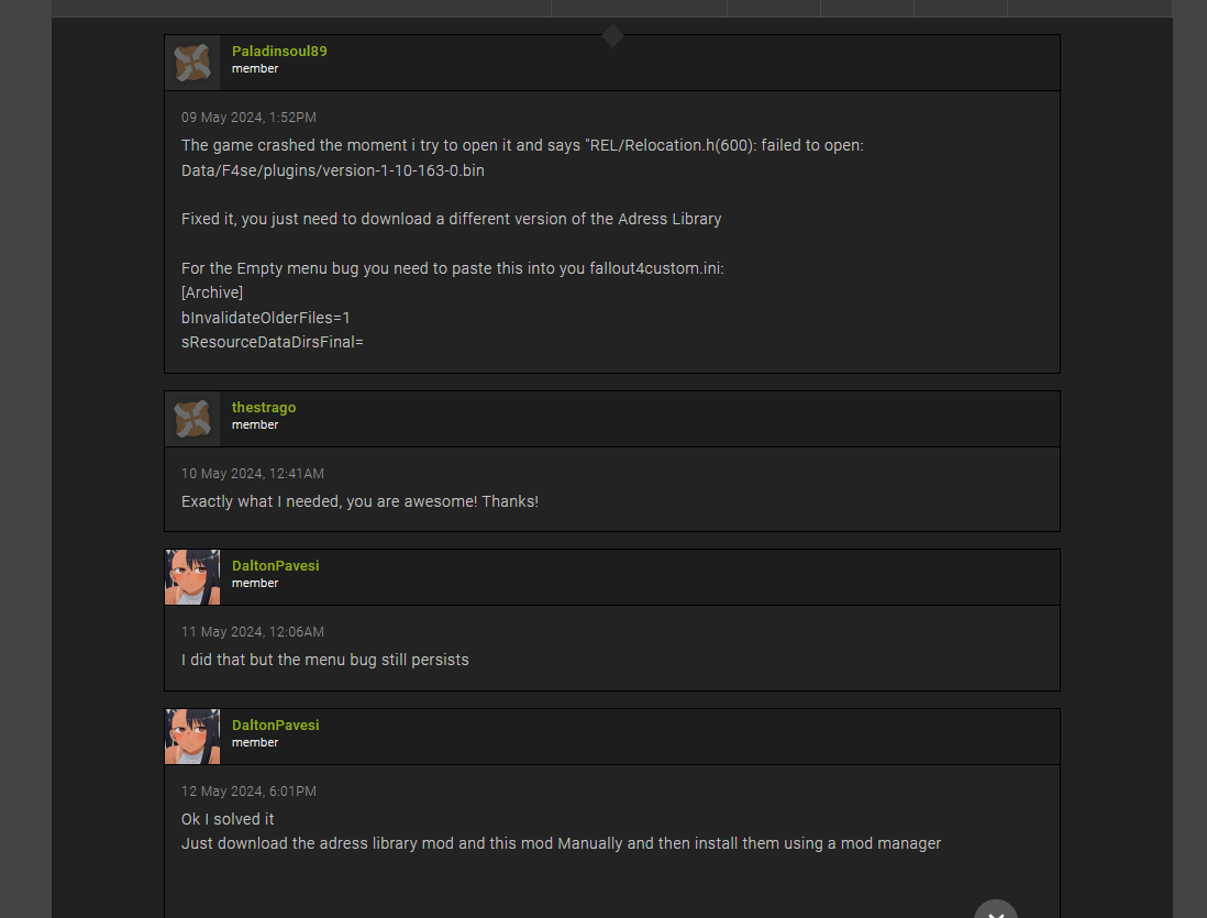 раз 10 переустановок и сработало. Причем на любой сборке такая ересь была, сейчас сборка 8.5 и там проблемы только с лимитом плагинов, причем в ESL если переводить все равно вылет и вот мне подсказали, что это BA2 перелимит, но почему раньше сверху ставила еще +100 модов , если не больше, а теперь 15 и все , вылет как только аудио догружается. Баффаут то стоит на 8.5 1.26 вроде, но все равно. Вот пытаюсь понять , что не так произошло. И где взять краш логи? Они в моих документах в папке с игрой должны быть?