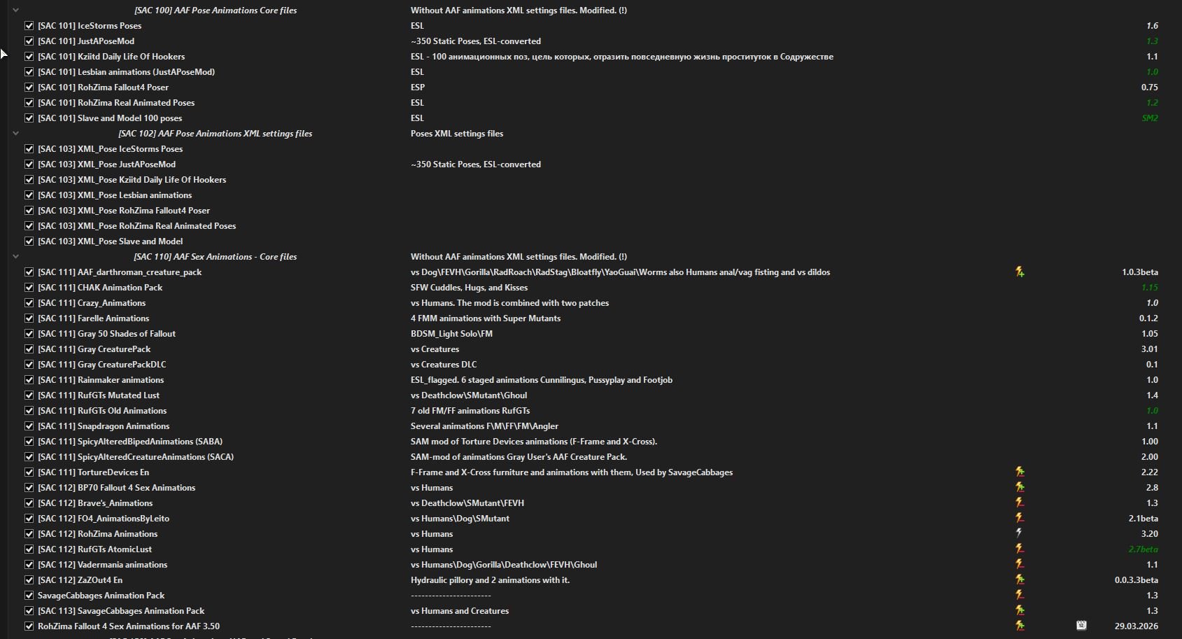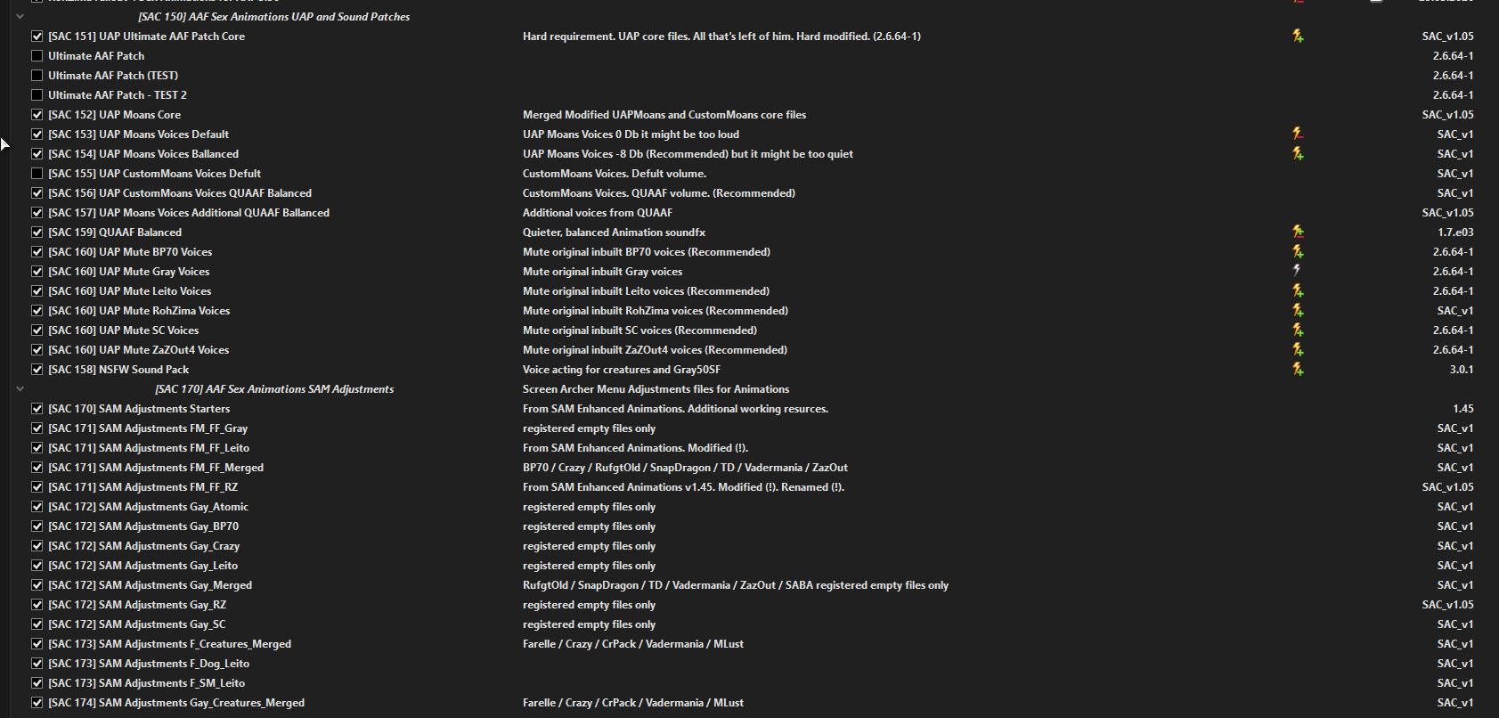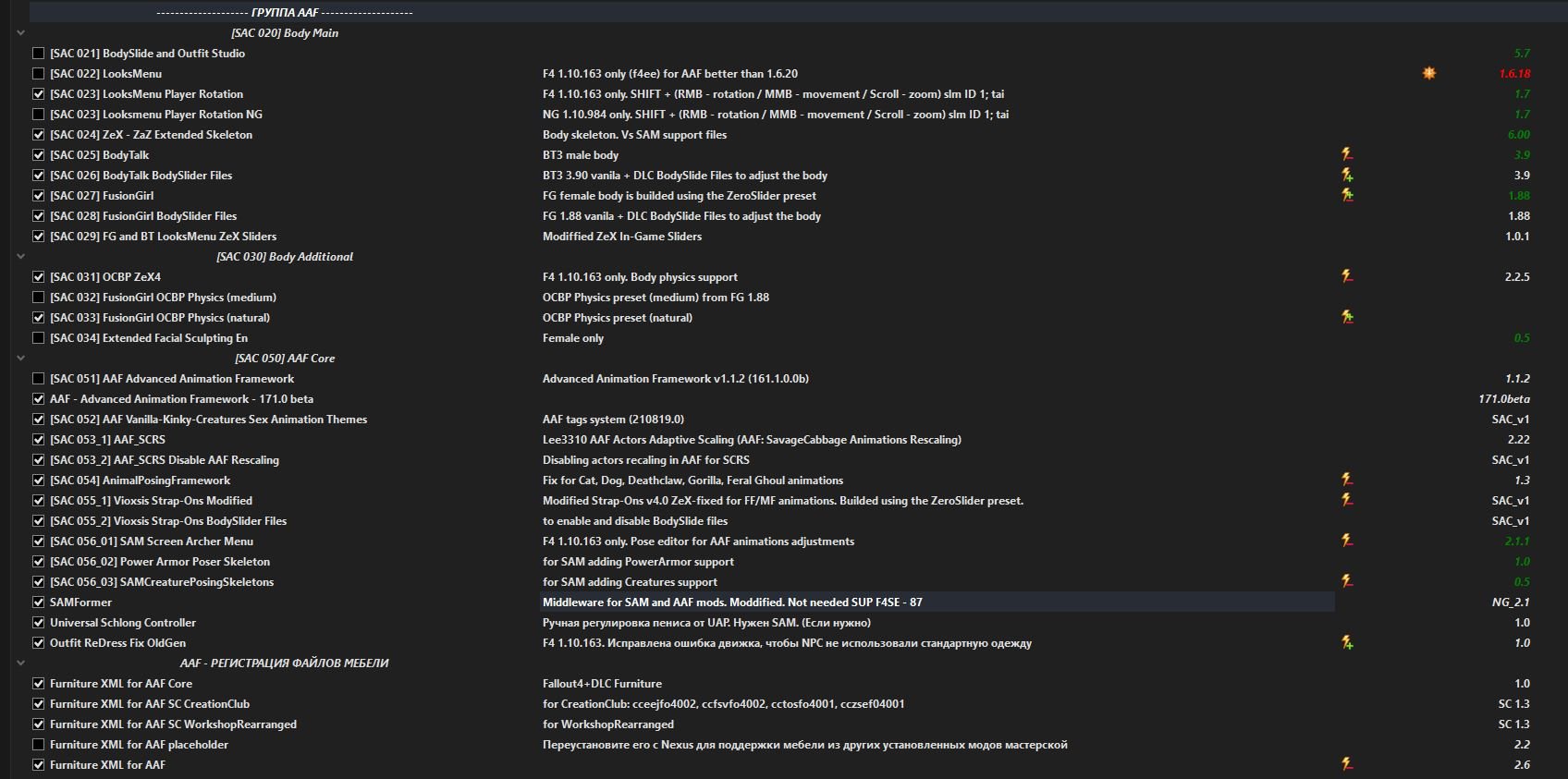 UPD. Попробовал SEU 1.16 с настройками по умолчанию - ошибок нет. Что-то не даёт моду напрямую сменить анимацию. Можно список всех установленных AAF модов?