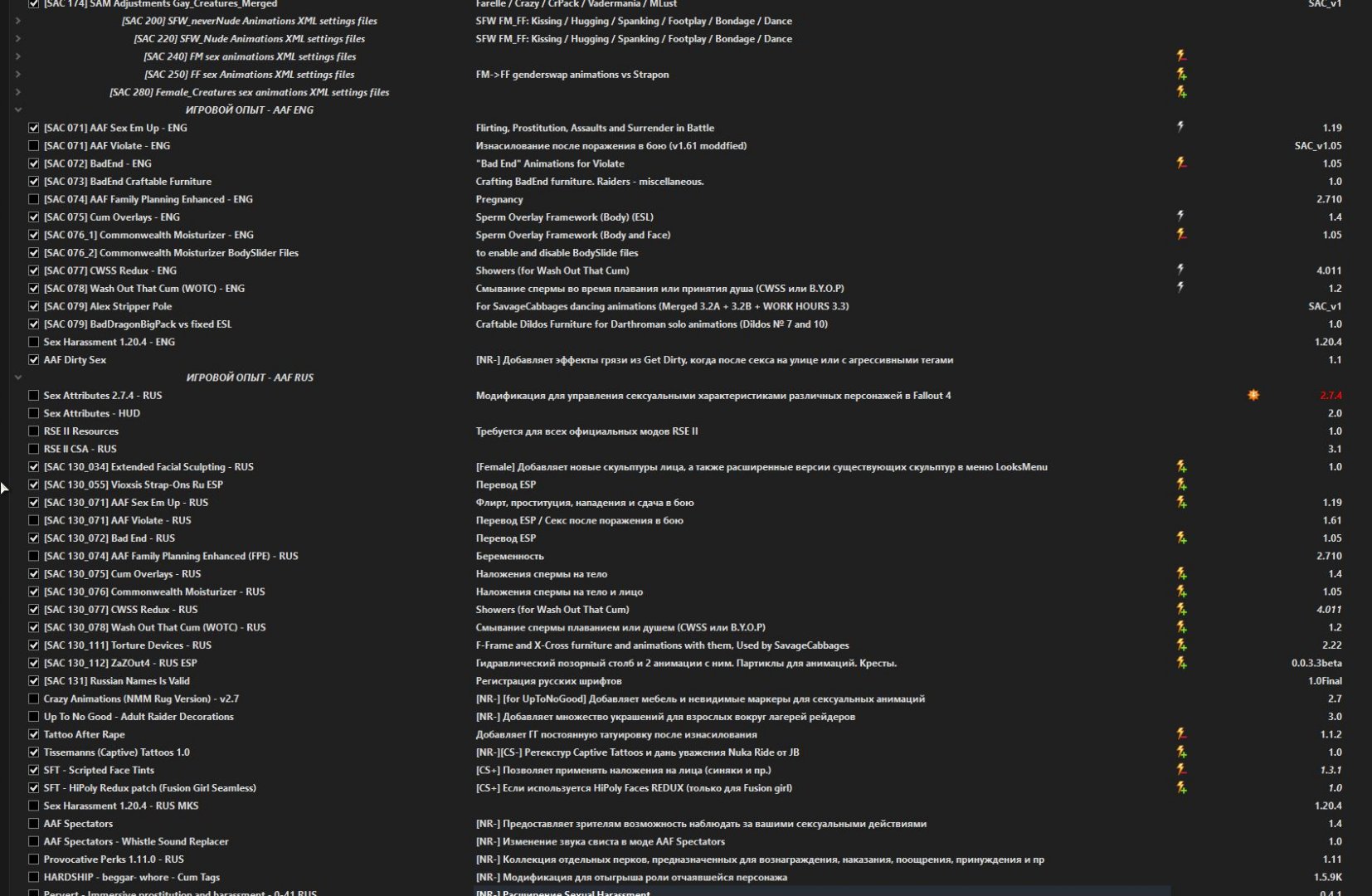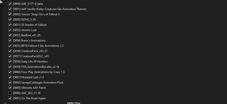 Рекомендуется создать новый профиль в MO2 конкретно для этого мода и в нём выключить вообще все секс-моды не указанные в зависимостях. Квестовые моды можете смело тоже отключать. Это совершенно другая игра и "обычные" моды вам не понадобятся. Подробности под спойлером "Атмосфера и совместимость" ниже.