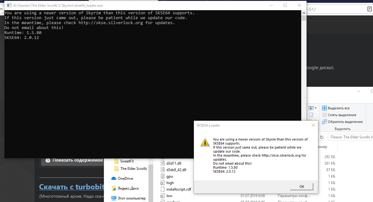 У меня такая же проблема как и у ivanhik . Только у него версия была неправильная, а у меня ровно такая как и на скриншоте и все равно пишет, что "СКСЕ версия 2.0.6 а Скай 1.5.62 освежите СКСЕ" ? А если освежать СКСЕ, то дальше так же с Racemenu  и тп.