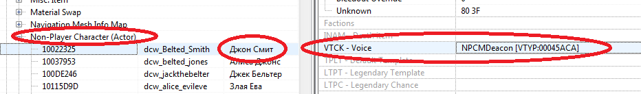 Открываем в моде раздел Non Player Character. Выбираем озвучиваемого НПС. Смотрим какой у него параметр VCTK - Voice