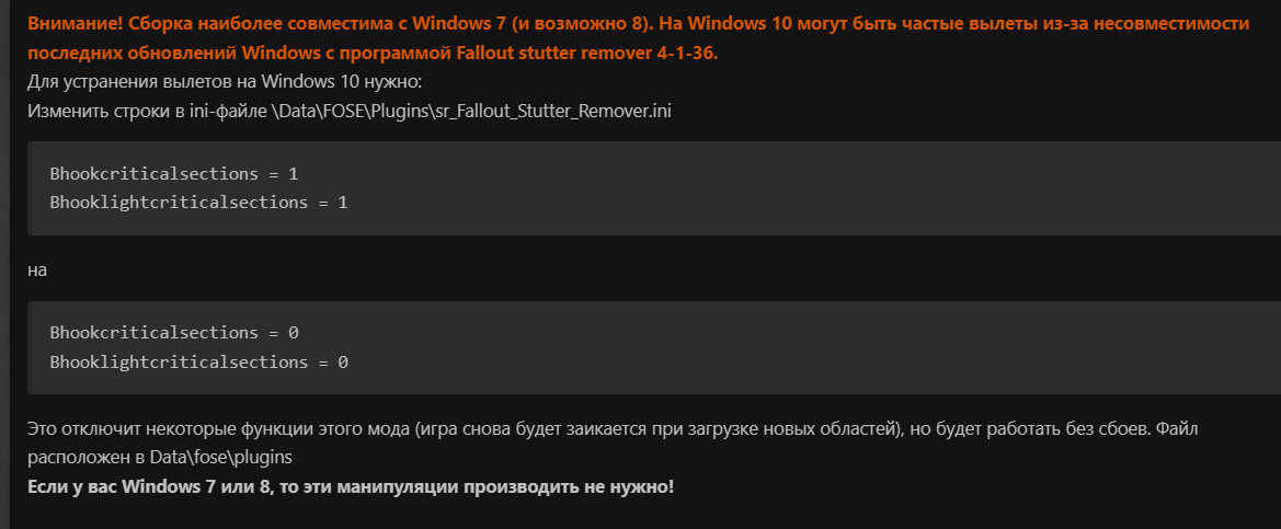 Гонял эту сборку на win10. Стабильность была гораздо хуже вегаса, вылеты намного чаще, но терпимо. Сейчас попробовал на win11 - беда полная. Всё установлено, разумеется, по инструкции, сборка чистая. Вылеты просто на каждый чих - загрузка локаций, начало/конец анимаций, подгрузка звуков и т.д., да и просто при стоянии на месте. Режимы совместимости, разные настройки графики - ничего не помогает и не меняет. Видимо, придётся пробовать в виртуалке на win7 или вообще XP...