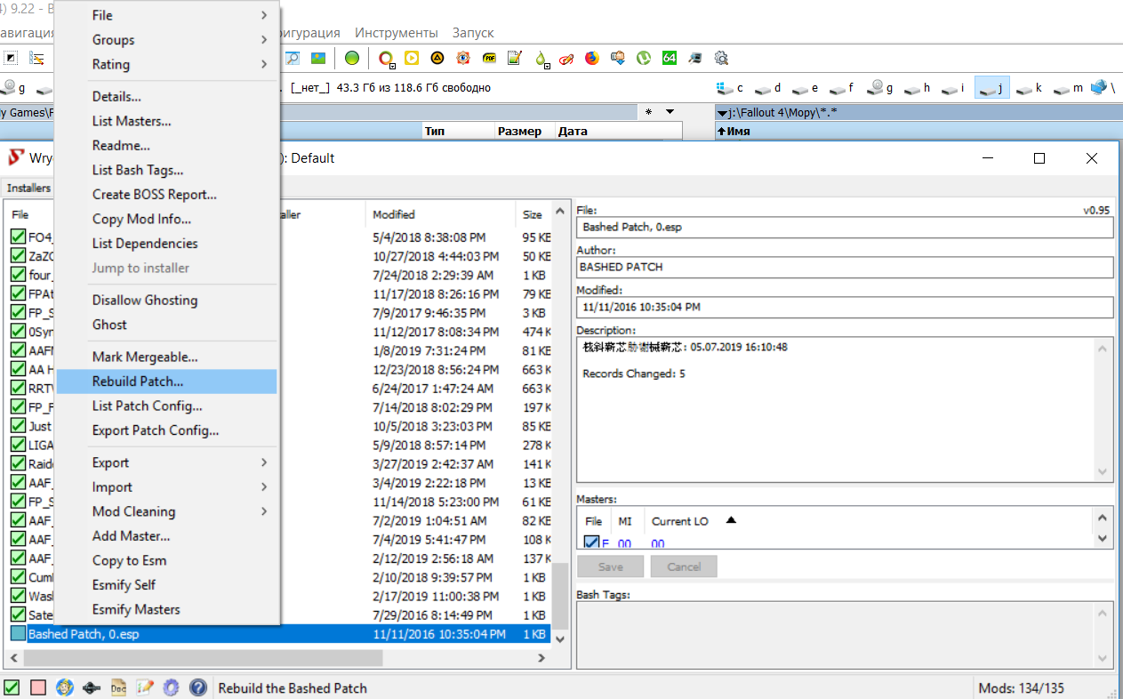 Язык Врай Баш настраивается в настройках, знак шестеренки внизу. Мод на радио можно воткнуть в середину списка, до секс-модов. Выше чем в приведенных вами скринах. Что до восстановления ранее удаленных предметов - у Вас где-то ошибка в процедуре работы с Врай Баш. Если нажимали там какие-то кнопки, кроме указанных, то явно изменили моды. Посему