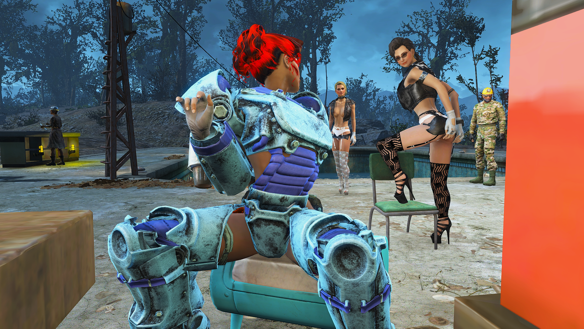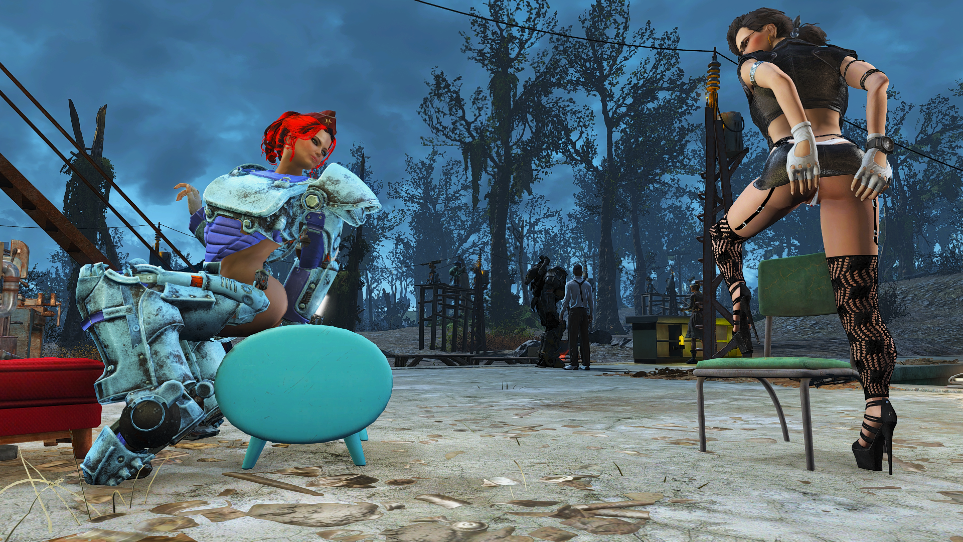 Алиса сидит, а обновлённая Рокси стоит на стульях.