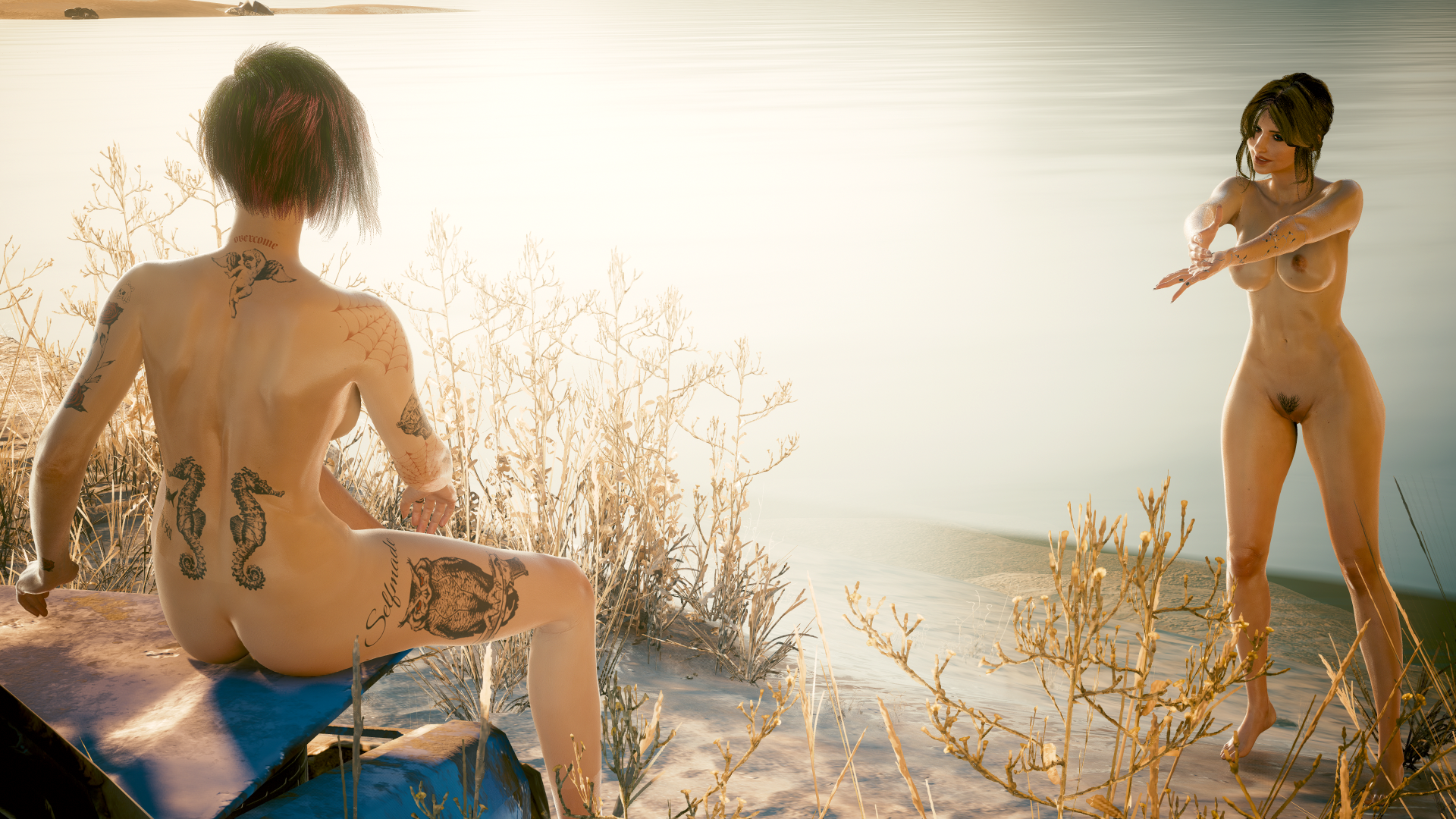 Джуди без своего гидрокостюма с аквалангом и с новым телом. На берегу у домика на озере.