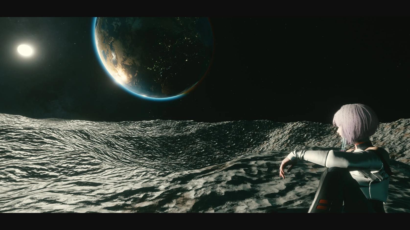Люси на луне - на фоне Солнца и Земли.
