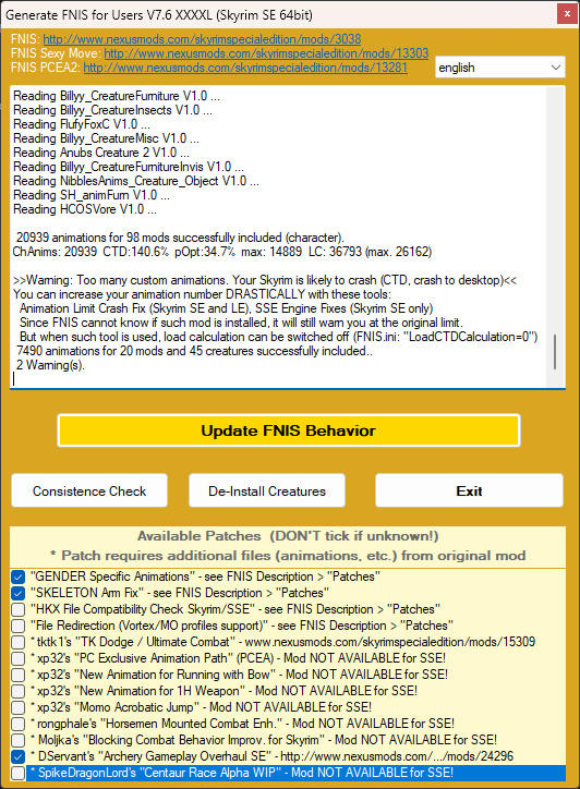 Если в игре возникли проблемы с анимациями, актеры зависают с расставленными руками в Т-позах. Нажмите кнопку «Запуск FNIS». В открывшемся окне должны быть выбраны галочки как на скриншоте ниже. После Нажмите кнопку Update FNIS Behavior и дождитесь когда программа закончит работу.