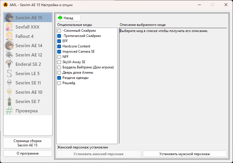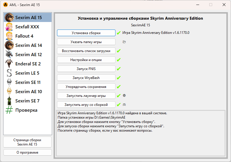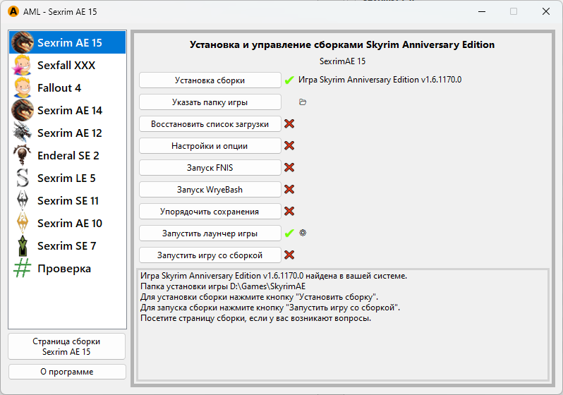 В левой колонке выберите игру Sexrim AE 15. Чтобы установить сборку, нажните кнопку «Установка сборки»