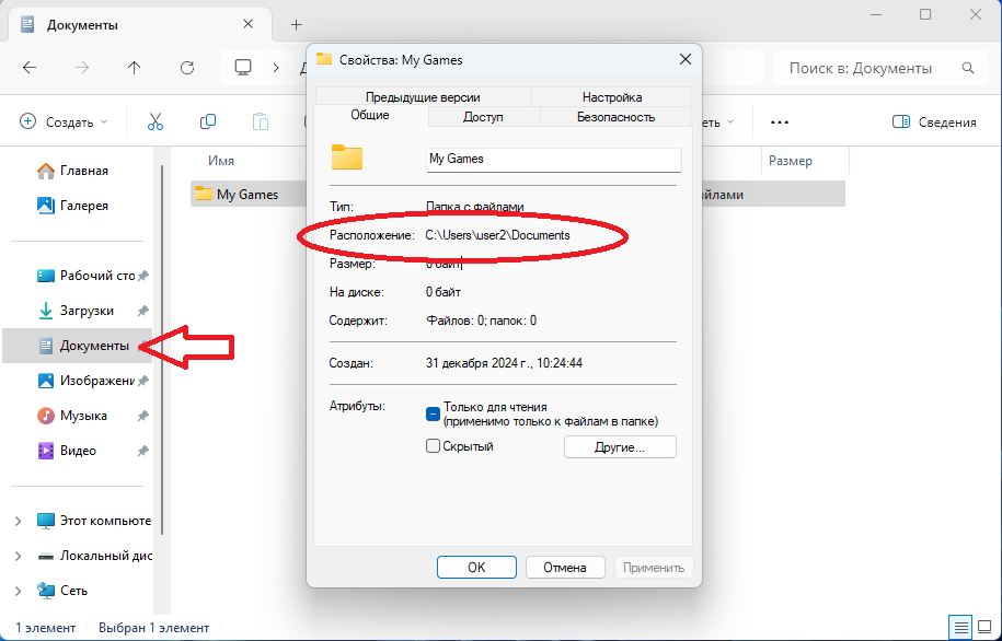 Откройте проводник, зайдите в папку документы по ярлыку в левой колонке окна. Создайте там папку My Games если её там нет.