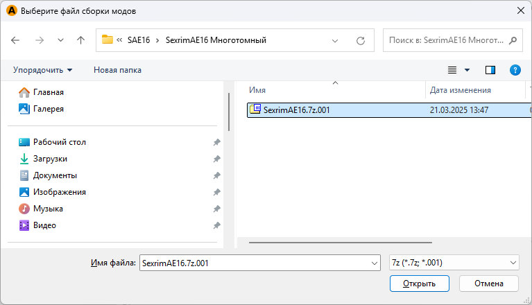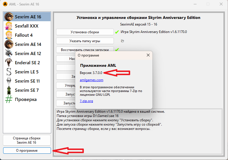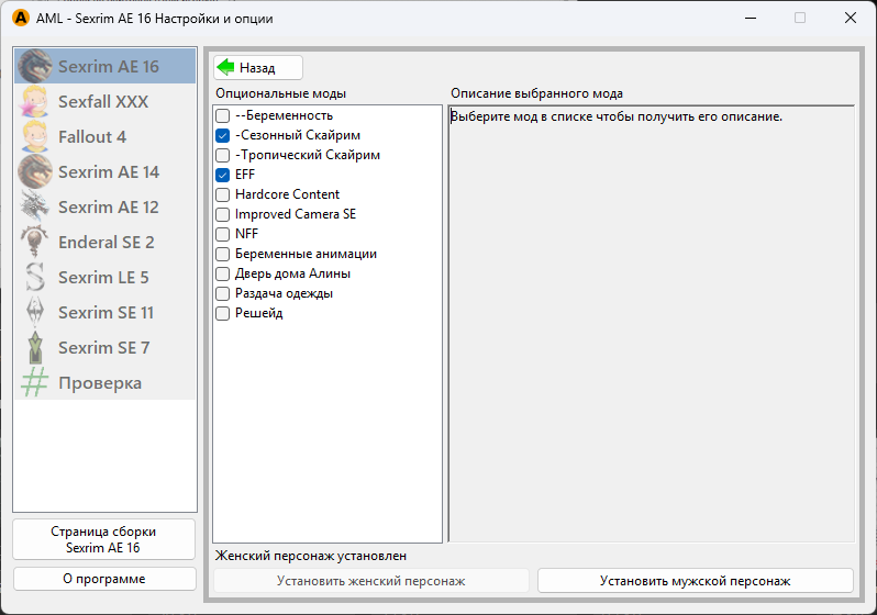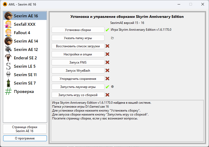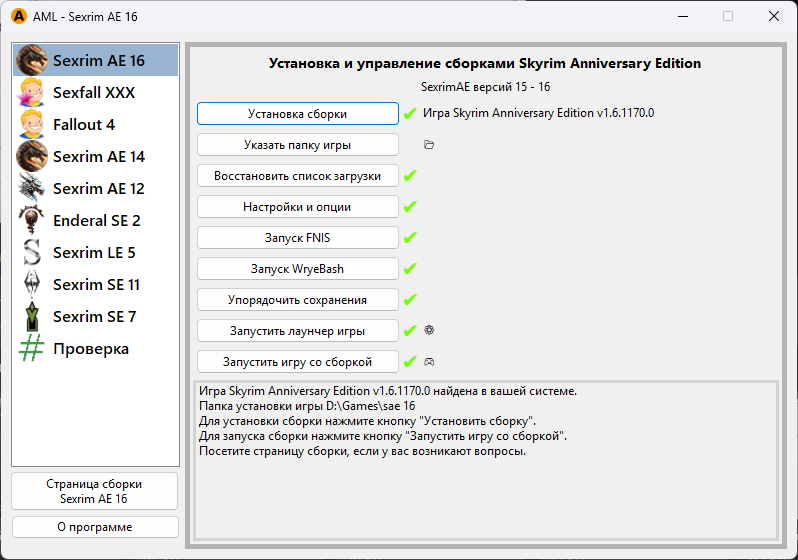 В левой колонке выберите игру Sexrim AE 16. Чтобы установить сборку, нажните кнопку «Установка сборки»