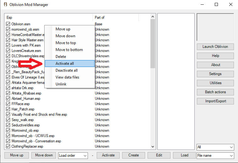 Ативируем (ставвим галочки) моды. Правой кнопкой мыши кликнуть по пустому полю справа от списка модов в ОВММ, и в открывшемся меню выбрать - "Activate All". Активируются все установленные моды.