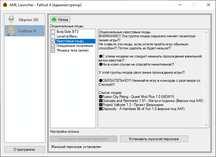 По умолчанию игра устанавливается для женского персонажа(ЖГГ) без дополнительных квестовых модов. Чтобы добавить контент, нажмите кнопку Настройки и опции. Поставьте галочки интересующих вас модов и они сразу установятся в игру.