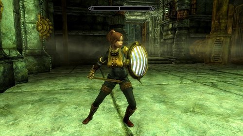 - Экипировка в основном сделана из кожи, а шлем и реактивный ранец выполнены в стиле двемеров.